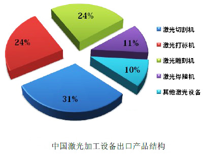 海外市場從國內進口的激光設備主要應用于激光切割、打標、雕刻、焊接等領域。最熱門的當屬激光切割機,高達31%;激光打標機和雕刻機持平,各占24%;激光焊接機占據10%,提升潛力巨大;其他激光設備占據11%,主要應用于熱處理微加工等領域。